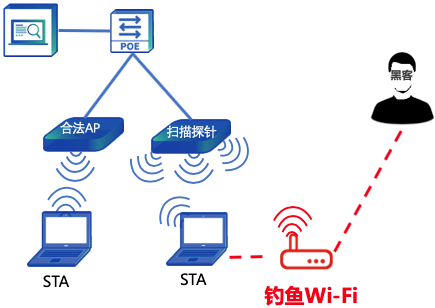 l 我們通過WIPS無線入侵防御系統(tǒng)實時檢測周圍無線信號,當檢測出來的信號BSSID、且AP源MAC地址不在授權(quán)列表中時,我們向?qū)?span>AP和終端發(fā)送解除關聯(lián)幀,讓終端無法連上釣魚Wi-Fi。7×24小時不間斷監(jiān)測網(wǎng)絡。