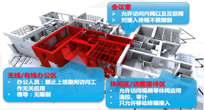 l 內(nèi)部員工可通過自己的辦公設備在企業(yè)大樓內(nèi)快速移動辦公,網(wǎng)絡接入更快速,上網(wǎng)行為管理系統(tǒng)對員工上網(wǎng)行為進行審計與管控。