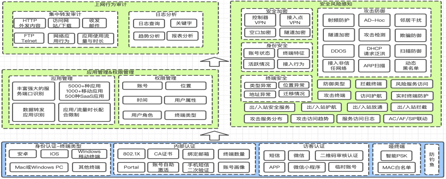 隨著互聯(lián)網(wǎng)的發(fā)展,移動終端的數(shù)量呈爆炸式的增長,需求也越發(fā)的廣泛,極大的推動了無線網(wǎng)絡的發(fā)展,對于企業(yè)而言,無線已經(jīng)成為終端接入的主導力量,BYOD、移動辦公已成大勢所趨,安全的企業(yè)WLAN的應用需求正在進一步加大;網(wǎng)絡需要提前為物聯(lián)網(wǎng)的增長做準備,滿足實時實地設備自動化部署;由于應用場景變得更加豐富多樣,因此網(wǎng)絡也隨之出現(xiàn)新的安全邊界,據(jù)統(tǒng)計全球80%的網(wǎng)絡安全事件發(fā)生在內(nèi)網(wǎng),為此建設一張身份權(quán)限可統(tǒng)一管理、具備內(nèi)網(wǎng)無線通信管控與防御,能夠清晰呈現(xiàn)業(yè)務數(shù)據(jù)、網(wǎng)絡狀態(tài)數(shù)據(jù)并方便維護與管理,有效發(fā)送相關告警提示的無線網(wǎng)絡已經(jīng)成為了大家建設過程中的共性要求。